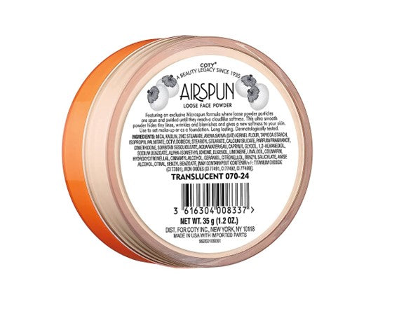 Airspun -Polvo suelto translúcido, matificante, ayuda a suavizar la apariencia de la piel. Larga duración,establece un acabado aterciopelado.